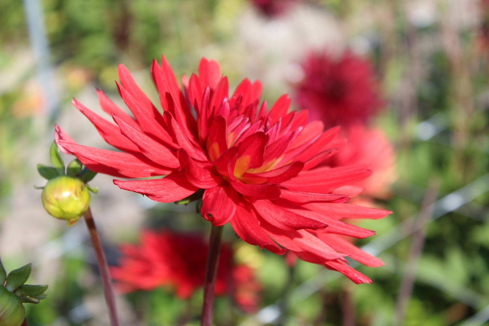 Pflanzen Sie Dahlienknollen von Mai bis Anfang Juni an einen sonnigen Standort. Setzen Sie die Knolle mit dem Auge nach oben nur wenige Zentimeter unter die Erdoberfläche. Halten Sie einen Pflanzabstand von 30–40 cm ein und gießen Sie anschließend leicht an.